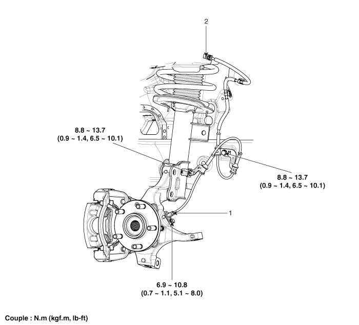 1. Capteur de vitesse de roue avant 2. Connecteur du capteur de vitesse de roue avant |