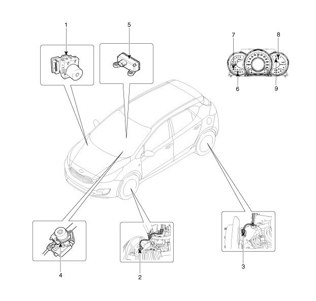 1. Module de contrôle de l'ESP (HECU) 2. Capteur de vitesse de roue avant 3. Capteur de vitesse de la roue arrière 4. Capteur de l'angle de direction 5. Capteur d’amplitude de mouvement de lacet et d’accélération latérale |