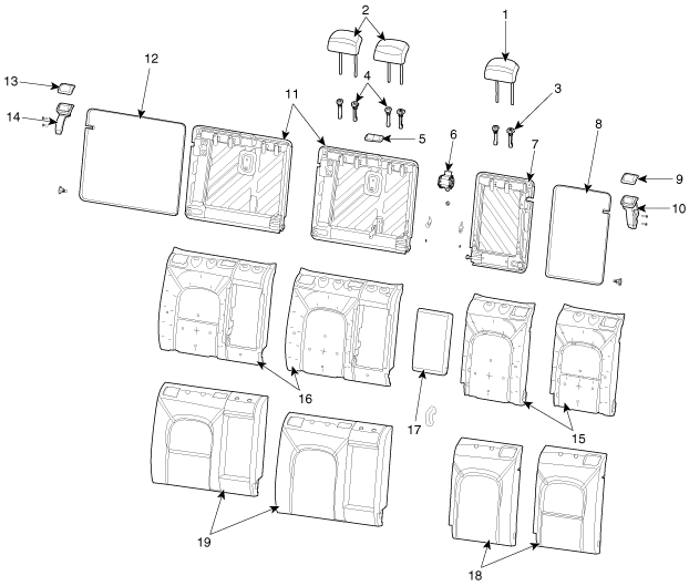 11. Structure de dossier de siège arrière [D] 12. Tapis du panneau de dossier de siège arrière [D] 13. Recouvrement du loquet du siège arrière [D] 14. Loquet de siège arrière [D] 15. Patin de dossier de siège arrière [G] 16. Patin de dossier de siège arrière [D] 17. Ensemble de l'accoudoir de siège arrière 18. Revêtement de dossier de siège arrière [G] 19. Revêtement de dossier de siège arrière [D] |