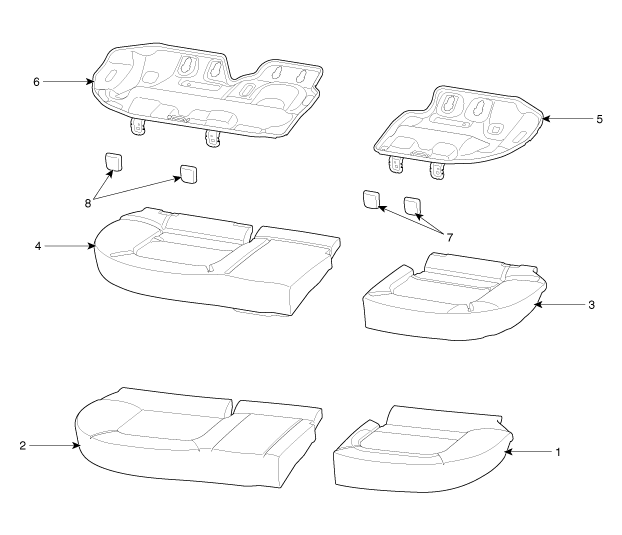 5. Cadre de coussin de siège arrière [G] 6. Cadre d'assise de siège arrière [D] 7. Revêtement de fixation d'assise de siège arrière [G] 8. Revêtement de fixation d'assise de siège arrière [D] |