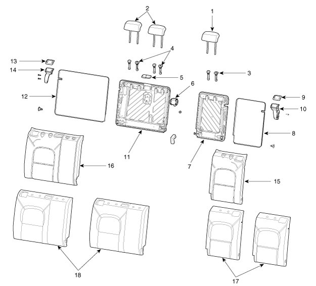 10. Loquet de siège arrière [G] 11. Structure de dossier de siège arrière [D] 12. Tapis du panneau de dossier de siège arrière [D] 13. Recouvrement du loquet du siège arrière [D] 14. Loquet de siège arrière [D] 15. Patin de dossier de siège arrière [G] 16. Patin de dossier de siège arrière [D] 17. Revêtement de dossier de siège arrière [G] 18. Revêtement de dossier de siège arrière [D] |