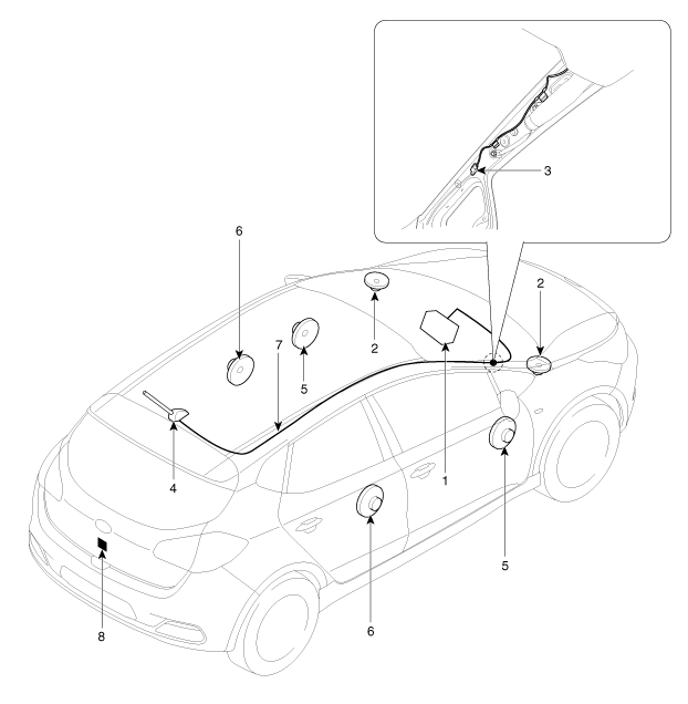 5. Haut-parleur de la porte avant 6. Haut-parleur de la porte arrière 7. Câble d'alimentation de l'antenne 8. Caméra arrière |