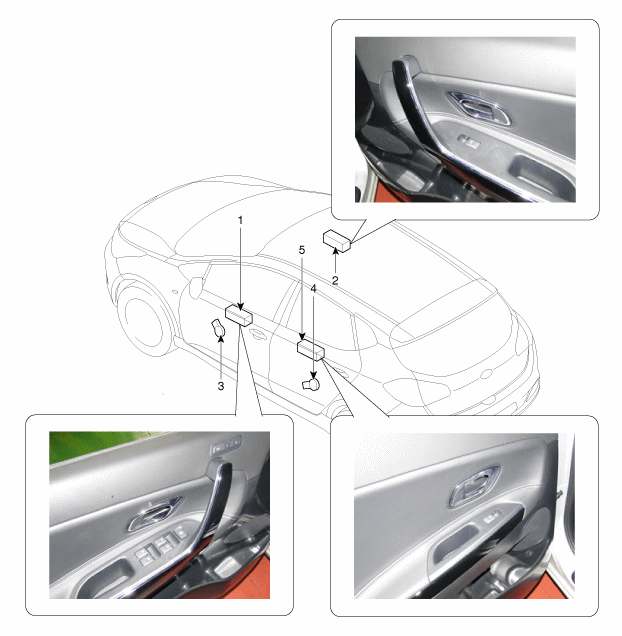 1. Interrupteur principal de la vitre électrique conducteur 2. Interrupteur de vitre électrique passager 3. Moteur de la vitre avant |