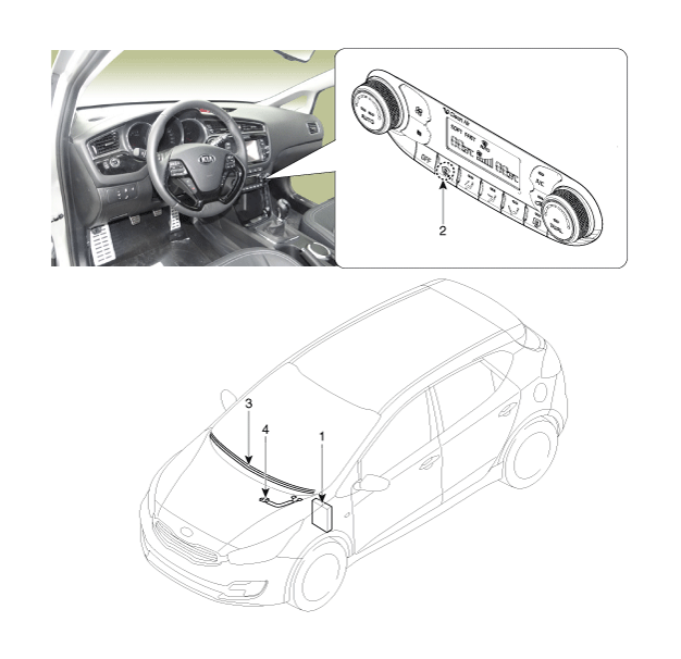 3. Dégivreur de pare-brise 4. Connecteur du dégivreur |