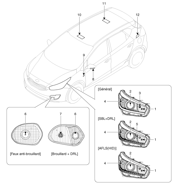 5. Voyant de déformation statique 6. Feu antibrouillard avant 7. DRL 8. Clignotant latéral (rétroviseur de porte) |