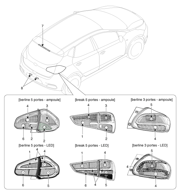 5. Feu de stop 6. Feu antibrouillard arrière 7. Feu de stop en hauteur 8. Éclairage de plaque d’immatriculation |