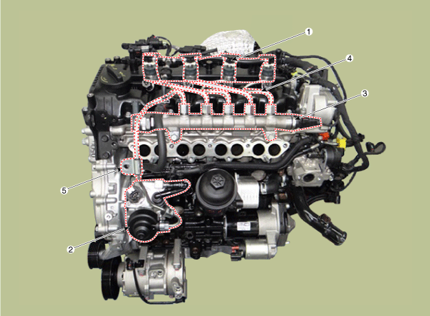1. Injecteur 2. Pompe à carburant à haute pression 3. Rail commun 4. Tuyau à carburant à haute Pression (Injecteur → Rail commun) |