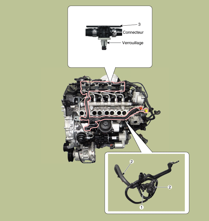 1. Conduite d'alimentation en carburant [Puissance basse] 2. Conduite de retour en carburant [Puissance basse] 3. Connecteur de conduite de retour |