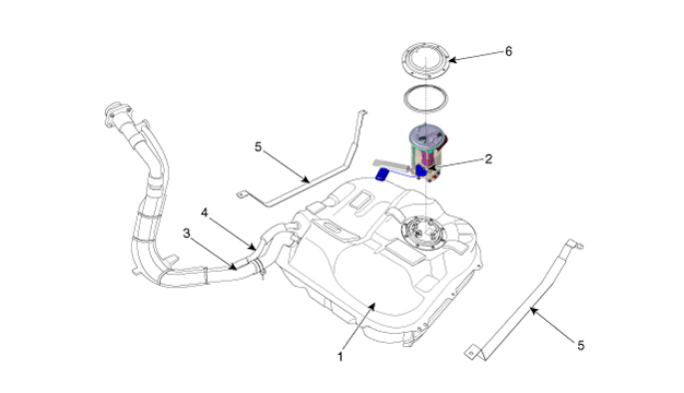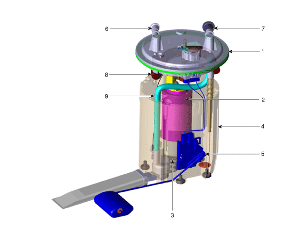 1. Ensemble de la tête 2. Moteur de la pompe à carburant 3. Pré-filtre 4) Chapeau de réservoir 5. Module de la pompe à carburant |
