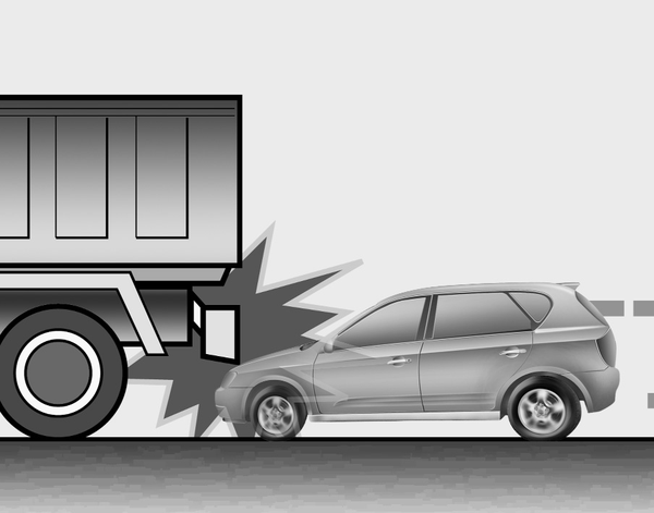 • Juste avant un impact, les conducteurs ont souvent le réflexe de freiner fortement. Lors de ce type de freinage violent, l'avant du véhicule s'abaisse ce qui peut le faire passer sous un autre véhicule ayant une garde au sol plus élevée. Dans cette situation, il est possible que les airbags ne se déclenchent pas car les forces de décélération détectées par les capteurs peuvent être compensées dans ce type de collision.