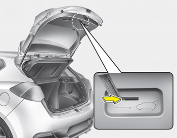 Votre véhicule est équipé d’un levier de dégagement d’urgence du hayon situé au bas de celui-ci. Si quelqu'un a été enfermé dans le coffre à bagages par inadvertance, vous pouvez procéder comme suit pour ouvrir le hayon :