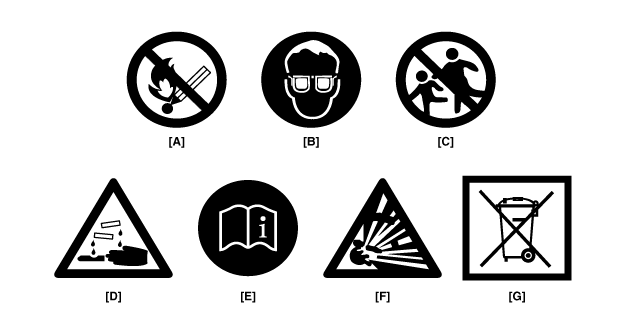 D Si de l′électrolyte pénètre dans vos yeux, rincez-les avec de l′eau propre pendant 15 minutes au moins et consultez immédiatement un médecin. Si possible, continuez d′appliquer de l′eau avec une éponge ou du tissu jusqu'à ce que vous ayez consulté un médecin. Si l'électrolyte entre en contact avec votre peau, nettoyez soigneusement la zone où le contact a eu lieu. Si vous ressentez des douleurs ou des sensations de brûlure, consultez immédiatement un médecin. |