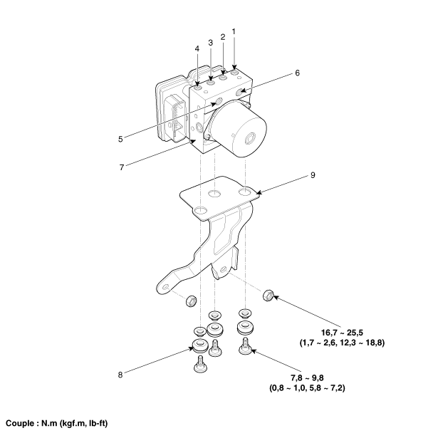 6. MC1 7. Module de contrôle de l'ESP (HECU) 8. Amortisseur 9. Support |