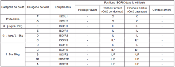 IL = S'adapte aux dispositifs de retenue enfant ISOFIX spécifiques répertoriés dans la liste jointe. Ces dispositifs de retenue enfant ISOFIX font partie des catégories « spécifique à un véhicule », « usage restreint » ou « semi-universel ».