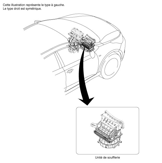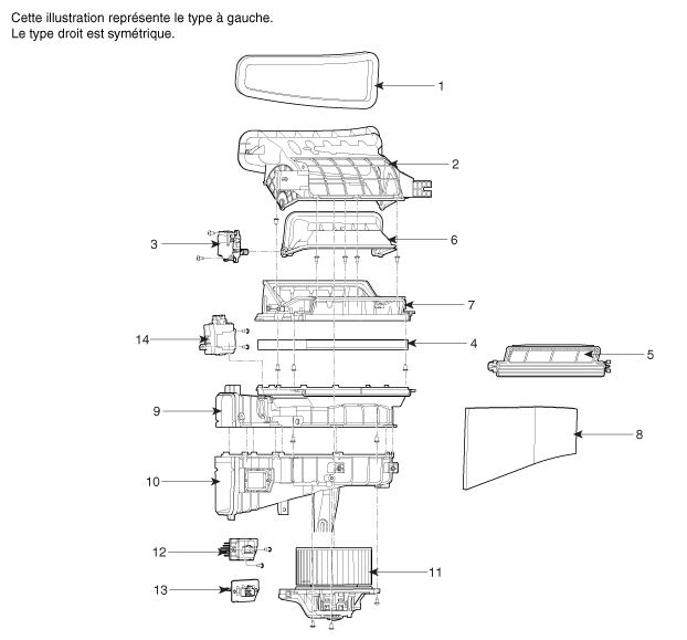8. Plaquette NVH 9. Carter supérieur de la soufflerie 10. Carter inférieur de la soufflerie 11. Moteur de soufflerie 12. Mosfet de puissance 13. Résistance de soufflerie 14. Ionisateur de groupe d'instruments |