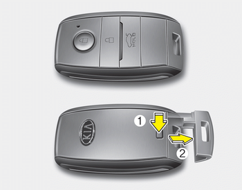 1.Appuyez sur le bouton de libération (1) et maintenez-le enfoncé, puis retirez la clé mécanique (2).